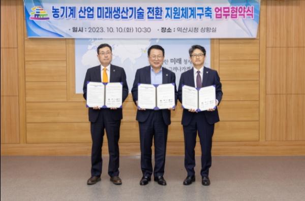 시는 10일 익산시청 상황실에서 농기계·뿌리산업의 소재·부품·장비 분야를 전문적으로 지원하는 국가연구기관인‘한국생산기술연구원’과 트랙터·콤바인 등 농업용기계의 국내 선두 기업이며 익산시에 소재한‘㈜TYM(동양물산)’대표들이 참석한 가운데 익산시 농기계 산업 미래 생산기술 전환 지원체계 구축을 위한 업무협약을 체결했다.