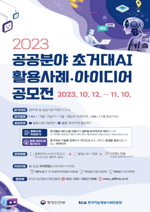 행정안전부는 올해 처음으로 ‘공공분야 초거대 인공지능 활용사례?아이디어 공모전’을 공공기관과 공무원을 대상으로 개최한다.