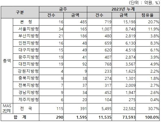 지역별 발주량을 보면, 총액계약 대상 1,204억 원 중 본청이 485억 원으로 40.3%를 집행하고 서울청 등 11개 지방청에서 719억 원을 각각 집행할 예정이다.
