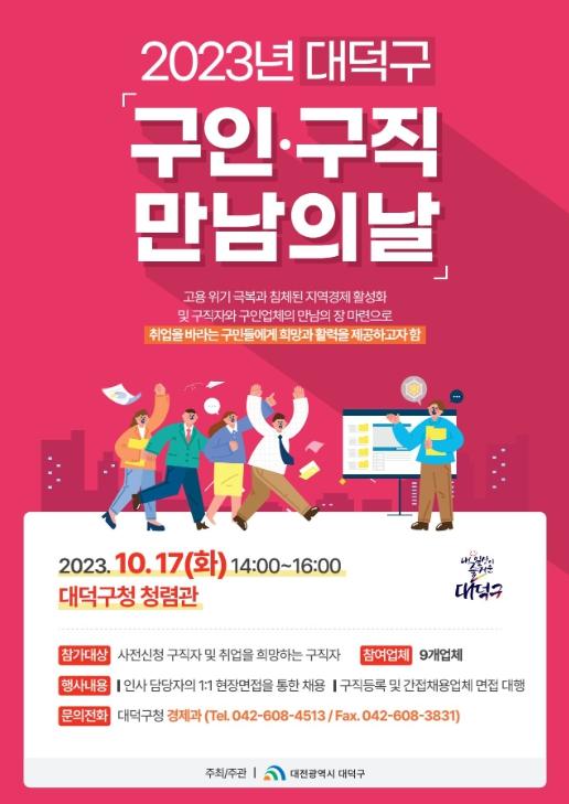 최충규 대덕구청장은 “취업 정보 제공, 고용 정책 소개는 물론 구직자와 구인 기업 간 현장 면접 및 채용이 이뤄지는 ‘2023 구인·구직 만남의 날’ 행사에 많은 관심을 가져주시길 바란다”고 말했다.