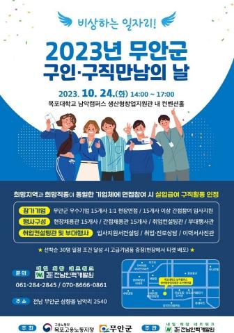 무안군은 오는 10월 24일 14시부터 17시까지 목포대학교 남악캠퍼스 생산형창업지원관 내 컨벤션 홀(삼향읍 남악 소재)에서 개최 예정인 ‘2023년 무안군 구인·구직 만남의 날’에 참여할 구직자를 모집한다고 밝혔다.