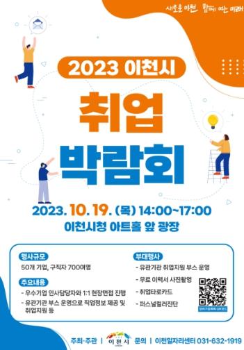 이천시는 기업의 맞춤형 인재 채용과 구직 시민의 폭넓은 취업기회 제공을 위하여 오는 10월 19일 오후 2시부터 5시까지 이천시청 아트홀 앞 모두의 광장에서 『2023 이천시 취업박람회』를 개최한다.