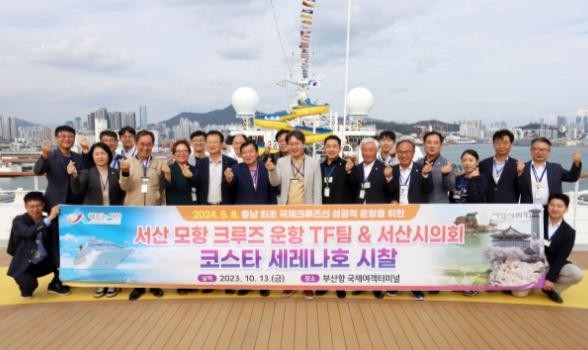 충남 서산시는 13일 부산항에서 서산 모항 크루즈선 운항 TF팀과 서산시의회가 함께 ‘코스타세레나호’를 방선 시찰했다고 밝혔다.