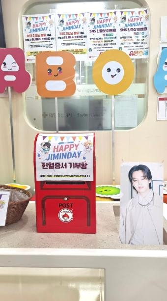 지민의 팬들은 대한적십자사 서울중앙혈액원, 부산혈액원과 손잡고, 10월 13일 지민의 생일을 맞아 헌혈 릴레이 프로젝트를 진행했다. 서울중앙혈액원과 부산혈액원은 지난 9월 21일부터 10월 13일까지 약 3주간 헌혈 릴레이 프로젝트를 진행했다. 3주 동안 방문한 팬들은 총 629여명 이상이었고, 이중 부적격 인원을 제외한 536명(서울 홍대 센터 230명, 부산 서면 센터 306명)이 헌혈에 동참했다.