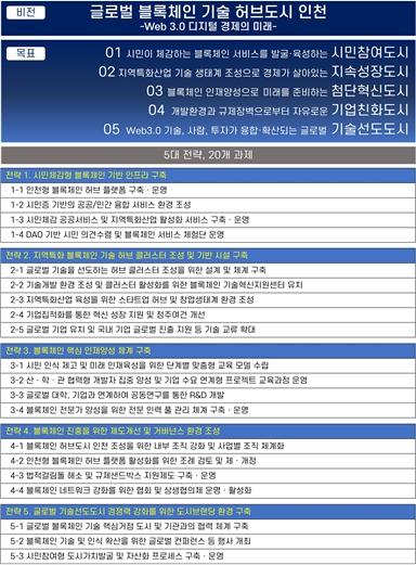 이를 통해 ‘글로벌 블록체인 기술 허브도시 인천 조성’을 비전으로 ▲시민 참여 도시 ▲지속 성장 도시 ▲첨단 혁신 도시 ▲기업 친화 도시 ▲글로벌 기술 선도 도시 등 총 5개 목표와 5대 전략, 20개 과제 및 45개의 실행 가능한 단위 사업을 도출했다.