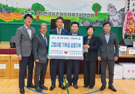 제주시연합회 임·회원은 지난 9월 19일 고창군 실내체육관에서 열린 ‘농촌지도자고창군연합회 한마음대회’에 참석해 고향사랑기부금 150만 원을 고창군에 기탁했으며 고창군연합회에서는 지난 12일 애월체육관에서 열린 ‘농촌지도자제주시연합회 한마음대회’를 찾아 고향사랑기부금 150만 원을 기탁했다.