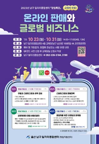 ‘온라인판매와 글로벌 비즈니스’교육은 오프라인으로 운영되며, QR코드로 사전신청이 가능하고, 교육관련 자세한 문의는 남구 일자리종합센터로 하면 된다.