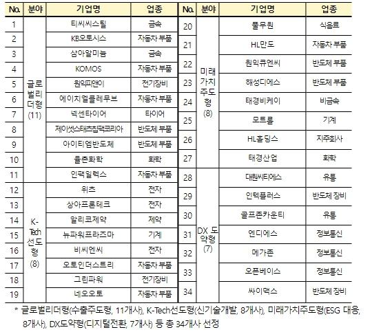 분야별로는 수출 주도형 11개사, 신기술 개발 8개사, 환경·사회·지배구조(ESG) 대응 8개사, 디지털 전환 7개사이며, 해외시장 확대를 추진하는 수출 주도형 기업(11개사)이 가장 많이 선정되어 수출 확대 및 세계(글로벌) 진출에 대한 중견 기업계의 높은 수요를 확인했다.
