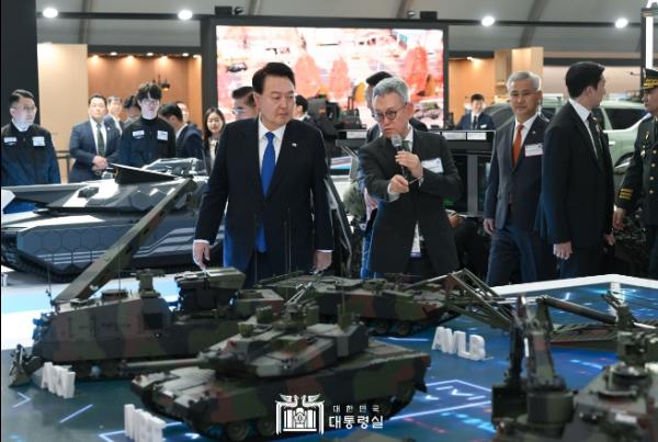 이후 대통령은 수리온 헬기, K-2 전차, K-9 자주포, FA-50 경공격기, KF-21 전투기 등 주요 무기체계가 전시된 야외 전시장을 관람했다. 대통령은 K-2 전차 앞에서 “NATO 등 해외에서 정상회의를 하면 K-2 전차, K-9 자주포 이야기가 빠지지 않는다”며, “K-방산을 수입해서 사용하면 다들 성능이 좋다고 평가한다”고 말했다.