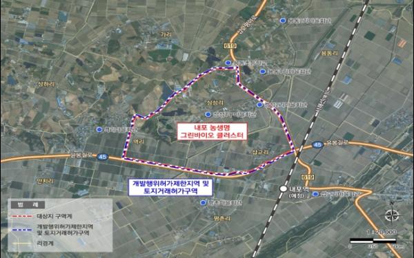 이번 지정은 도와 예산군이 추진 예정인 내포 농생명 그린바이오 클러스터 개발 기대에 따른 부동산 투기행위 예방과 성공적인 개발사업 지원을 목적으로, 예산군이 요청한 대상지의 개발행위허가 제한지역과 동일하게 지정했다.