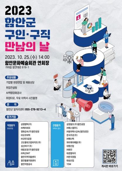 함안군은 구인기업에게 우수한 인재를 연계하고 구직자에게 다양한 취업정보를 제공하는 현장 중심의 맞춤형 채용행사인 ‘2023년 구인·구직 만남의 날’을 오는 25일 오후 2시부터 4시까지 함안문화예술회관 연회장에서 개최한다고 밝혔다.