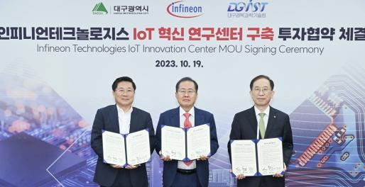 대구광역시, 대구경북과학기술원, 인피니언테크놀로지스코리아(유)는 10월 19일 오전 11시 20분 대구 엑스코에서 인피니언테크놀로지스코리아(유) IoT 혁신센터(IoT Innovation Center) 설립 협약을 체결했다.