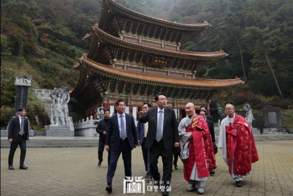 윤석열 대통령은 10월 19일 오후 충북 단양에 있는 천태종의 본산인 구인사를 방문해 종정 도용스님을 예방하고, 국가와 국민의 평안을 기원했다.