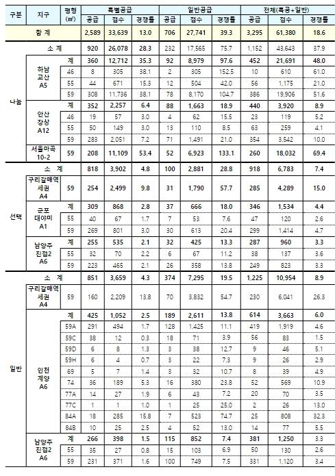 유형별로는 나눔형 37.9대 1, 선택형 7.4대 1, 일반형 8.9대 1을 기록하여 나눔형이 가장 높은 경쟁률을 나타냈다. 나눔형 중에서는 청년 특별공급이 91.1대 1로 가장 높은 경쟁률을 보였다.