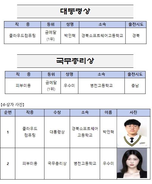대회 최고 득점 선수에게 수여되는 대통령상은 박민혁(클라우드컴퓨팅 직종) 군이 수상했으며, 국무총리상은 우수미(피부미용 직종) 양이 받았다.