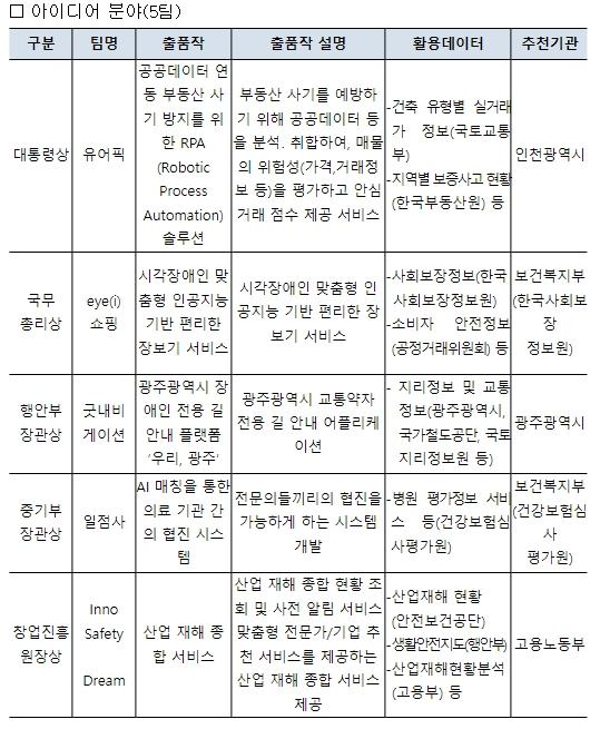 아이디어 분야에서 ‘공공데이터 연동 부동산 사기 방지를 위한 RPA (Robotic Process Automation) 솔루션’을 출품한 ‘유어픽’팀, 제품 및 서비스 개발 분야에서 ‘ANRISK- 인공지능 기반 뇌동맥류 발병 위험도 예측 플랫폼’을 출품한 ‘탈로스’팀이 각각 대통령상을 수상했다.