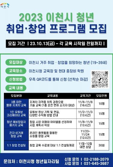 모집 대상자는 이천시에 거주하며 취업과 창업을 준비하는 19~39세 청년이다. 모집 기간은 10월 13일부터 각 교육 프로그램 시작일 전일까지(프로그램별 교육일은 아래 표 참조)이고 모든 교육은 무료로 진행된다.