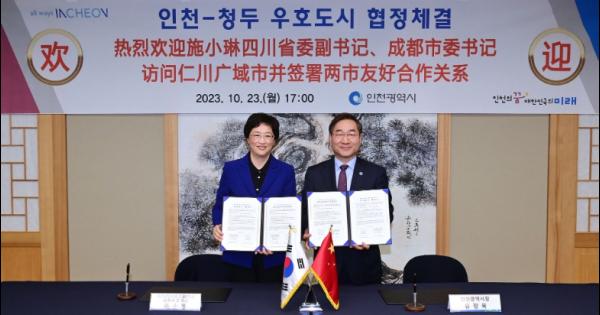 인천광역시는 23일 인천시를 방문한 스샤오린(施小琳) 청두시위원회 서기를 접견하고, 양 도시 우호도시 협정체결을 맺었다고 밝혔다.