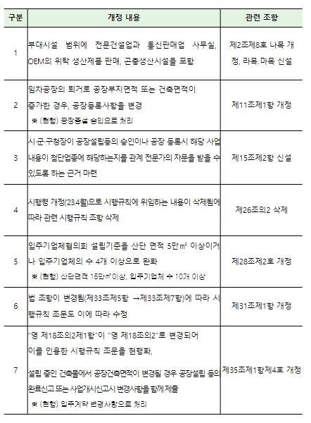 그 이외에도 입주기업체협의회 설립요건 완화, 설립 중인 건축물 면적 변경 시 신고 절차 간소화 등을 개정하여 입주기업체의 불편과 경영애로 사항을 해소할 예정이다. 향후에도 입주기업체의 애로사항을 지속적으로 발굴하여 해결해 나갈 계획이다.