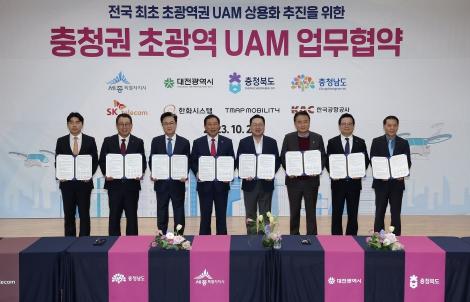 충남도와 대전·세종·충북 등 충청권은 25일 세종시 지방자치회관에서 한국형 도심항공교통(K-UAM) 드림팀 컨소시엄의 에스케이텔레콤(SKT), 한화시스템, 티맵모빌리티, 한국공항공사와 8자 간 업무협약을 체결했다.