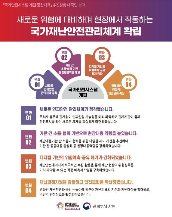 행정안전부는 25일 지난 10개월간의 국가안전시스템 개편 추진 경과와 달라진 점, 그리고 향후 추진이 필요한 과제 등'국가안전시스템 개편 종합대책'추진상황을 발표했다.