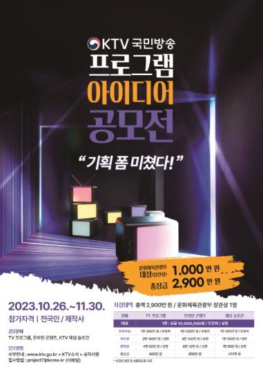KTV 국민방송(원장 하종대)은 26일 국민과의 신속한 정책 소통과 정책 공감 콘텐츠 발굴을 위해 '프로그램 아이디어 공모전'을 개최한다고 밝혔다.