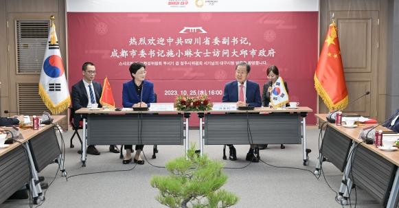 스샤오린(施小琳) 당 쓰촨성 위원회 부서기 겸 청두시 위원회 서기를 단장으로 하는 중국 청두시 대표단이 25일 대구광역시를 방문했다. 대표단은 스샤오린 당 서기 포함 장진취안 상무국 국장, 후빈 자연자원국 국장, 장연웨이 투자촉진국 부국장 등 13명으로 구성됐다.