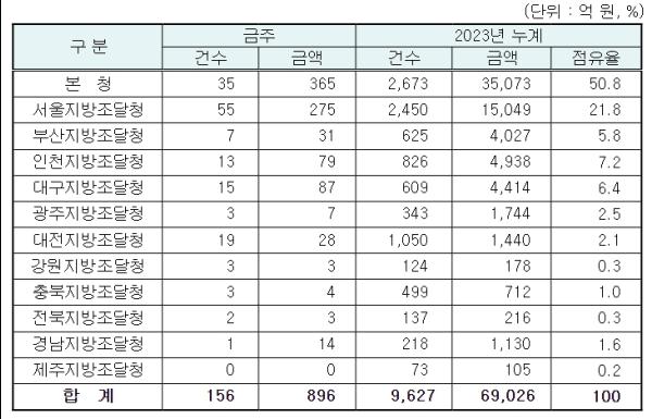 지역별 발주량을 보면 대전광역시 소재 본청 365억 원, 서울지방청 275억 원 등 2개청(640억 원)이 전체 금액(896억 원)의 71.4%를 차지하고 있으며, 인천 등 나머지 10개 지방청 256억 원이 각각 집행될 예정이다.