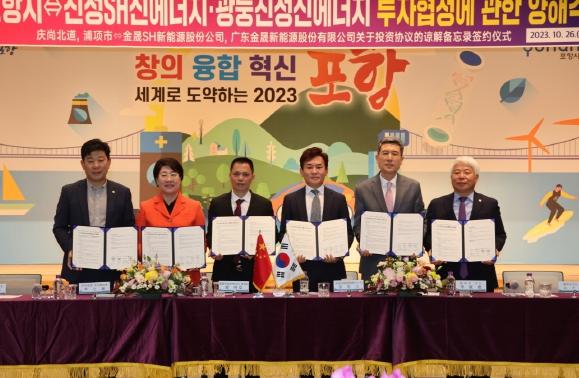 포항시와 경상북도는 26일 이강덕 포항시장, 백인규 포항시의회 의장, 이달희 경북도 경제부지사, 박용선 도의회 부의장, 김욱한 진성SH신에너지 대표, 리야오 중국 광둥진성신에너지 총경리 등이 참석한 가운데 진성SH신에너지와 투자협약을 체결했다.