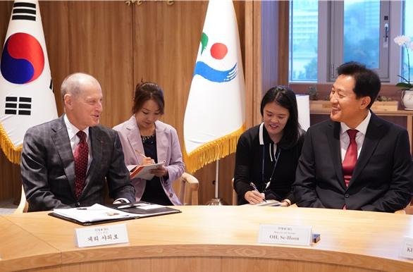 오세훈 시장은 26일, 세계 최대 가전·IT 전시회 CES(Consumer Electronics Show)를 주관하는 미국소비자기술협회 CTA(Consumer Technology Association) 게리 샤피로(Gary J. Shapiro) 회장을 만났다.
