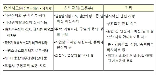 이 외에, 선내에서 일어날 수 있는 안전사고에 대비하여 선원들의 넘어짐, 끼임, 추락 등 산업재해 예방조치와 보호장비 구비 여부도 확인하고 지도할 예정이다.