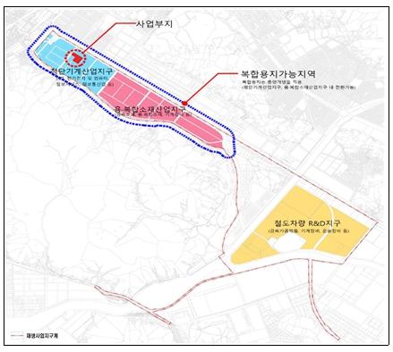 복합용지는 국토교통부에서 승인한 재생사업 계획에 따라 첨단기계 산업지구, 융·복합소재산업 지구에 1만㎡ 이상 규모의 블록 단위 개발로 추진할 수 있다.