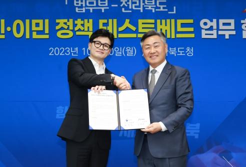 전북도와 법무부는 30일 전북도청에서 ‘외국인?이민정책 테스트베드 업무협약’을 체결하고 앞으로 새로운 외국인 이민정책을 통해 지방소멸위기에 공동으로 대응하기로 했다.