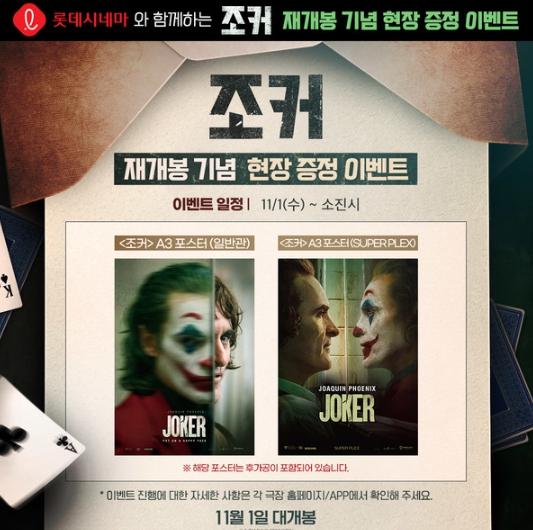 '조커' 의 재개봉 기념 현장 증정 이벤트는 전국 CGV, 롯데시네마, 메가박스, 씨네Q에서 11월 1일(수) 동시에 시작한다.