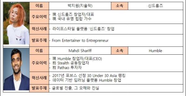 유튜브 조회수 천만, 광고, 방송 등 상반기 가장 주목받는 뮤지션 중 한명이며 생활양식(라이프스타일) 플랫폼 ‘신드롬즈’를 창업한 지올팍을 첫 번째 연사로, 자료(데이터) 기반 딥러닝 플랫폼 험블(Humble)을 창업한 Mahdi Shariff 등 약 60명의 국내·외 패널(연사)이 참여하여 국내외 창업기업(스타트업)들의 생생한 이야기를 전한다.