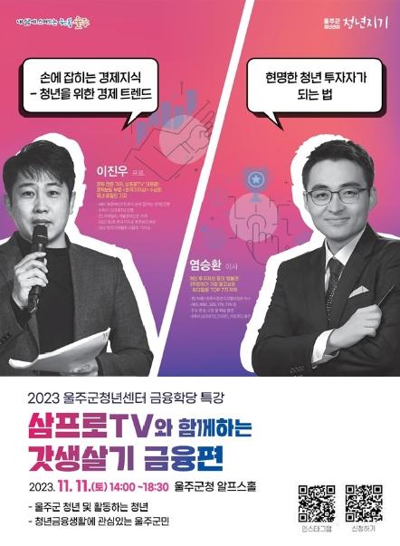 울주군 청년센터 ‘청년지기’가 11월 11일 오후 2시 울주군청 알프스홀에서 금융생활강화아카데미 금융학당 특강 ‘삼프로TV와 함께하는 갓생살기 금융편’을 개최한다고 31일 밝혔다.
