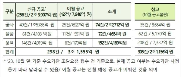 이 가운데 신규 공고는 256건, 2조 3,907억 원, 이월 공고는 42건, 7,648억 원 규모다.