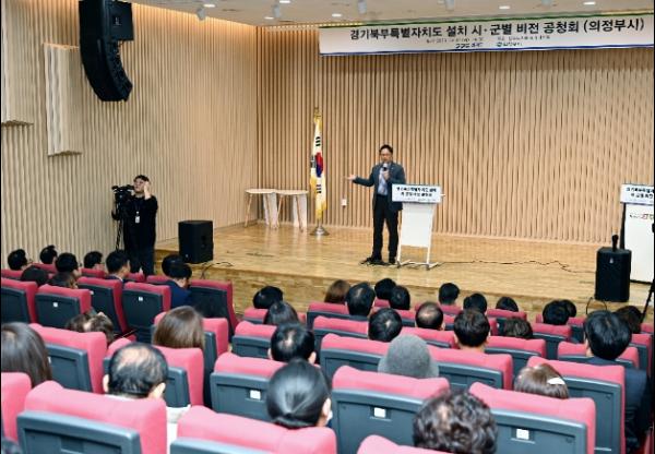 경기도는 31일 의정부시 정보도서관에서 김동근 의정부시장, 김현주 의정부시의회 부의장, 김민철 국회의원, 오후석 경기도 행정2부지사를 비롯한 도의원, 시의원, 지역주민 등 100여 명이 함께한 가운데 ‘경기북부특별자치도 설치 추진 시군별 비전 공청회’를 열었다.