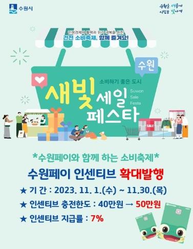 수원시가 ‘제2회 새빛세일페스타, 수원’ 개최를 기념해 11월 한 달 동안 ‘수원페이 인센티브’ 충전 한도를 기존 40만 원에서 50만 원으로 확대한다.