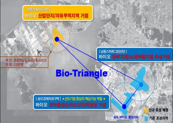 이에 인천시는 바이오의약품 생산 및 연구개발(R&D), 인력 양성의 거점인 송도 바이오 클러스터를 중심으로 바이오 원부자재 및 소부장 육성 거점으로 남동 지역과 바이오 글로벌 협력 거점으로 영종 지역을 연결하는 바이오-트라이앵글(Bio-Triangle) 특화단지 조성 전략을 구상하고 있다.