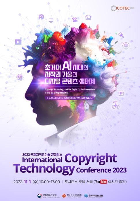 문화체육관광부는 한국저작권위원회(위원장 최병구), 한국저작권보호원(원장 박정렬)과 함께 11월 1일 포시즌스호텔 서울에서 ‘2023 국제 저작권기술 콘퍼런스(ICOTEC, International Copyright Technology Conference)’를 개최한다.