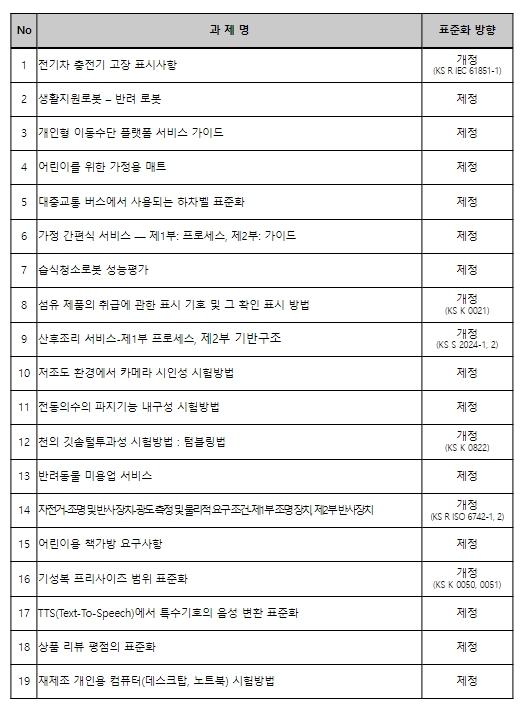 일상에서 사용하는 로봇, 전기차 충전기, 개인형 이동수단 플랫폼 등 제품과 서비스에 대한 품질 확보와 통일화를 통해 생활편의를 제고할 방침이다. ① 반려로봇의 성능기준과 평가방법 표준화를 통해 1인 가구, 노인가구 등의 생활 편의 향상을 추진한다. ②또한 전기차 충전 과정에서 발생 가능한 오류의 표시 내용을 통일화하여 전기차와 충전기의 고장 여부 확인이 어려웠던 불편을 해소할 예정이다. ③아울러 개인형 이동수단 플랫폼 서비스의 품질 제고를 위해 서비스 절차와 품질관리에 대한 표준화를 추진한다. 최종 선정된 표준화 과제에 대해서는 11월부터 이해관계자의 의견수렴을 거쳐 표준안 개발을 추진할 예정이다.