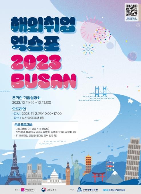 한국산업인력공단(이사장 직무대행 김영중)은 해외취업을 희망하는 부산·울산·경남 지역 청년들을 위해, 부산광역시청에서 “해외취업 엑스포 2023 부산”을 부산경제진흥원과 2일 공동 개최한다.