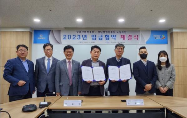 성남산업진흥원과 노동조합은 성남시 지방 출자·출연기관 예산편성기준 알림에 따라 2023년 7월부터 임금교섭 상견례를 시작으로 약 4개월간의 실무교섭을 10회 이상 걸쳐 최종합의안을 도출했으며, 이날 노·사관계자 9명이 모인 가운데 2023년 임금협약이 체결됐다.
