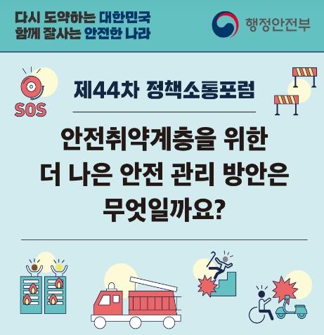 행정안전부는 장애인과 고령자 등을 위한“안전취약계층을 위한 더 나은 안전관리 방안은 무엇일까요? ”라는 주제로 11월 2일, 서울 정책소통포럼 공간에서‘제44차 정책소통포럼’을 개최한다고 밝혔다.