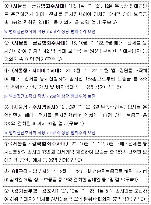 특히, 전국적으로 12,000여채를 보유한 ‘무자본갭투자’ 15개 조직을 일망타진하고 이 중 9개 조직 122명에 대해 범죄단체등으로 의율하여 엄단했고, 허위 전세계약서로 전세자금 대출금 788억원을 가로챈 ‘21개 전세자금대출사기조직’ 및 각종 전세사기에 가담한 ‘불법중개ㆍ감정행위자’도 965명을 검거했다.