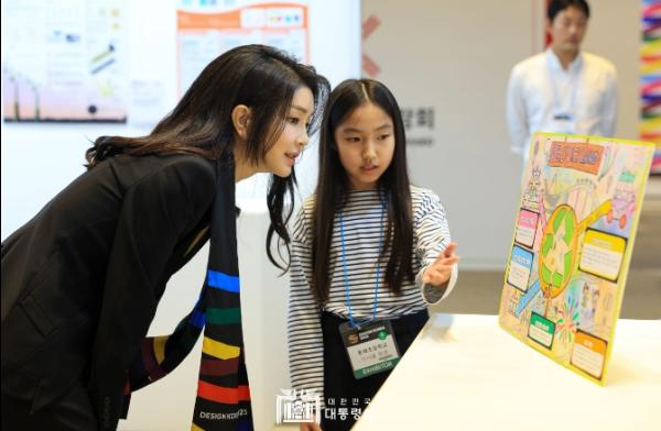 이어 김 여사는 올해 21회째인 디자인 코리아 2023의 개막을 축하하며 디자인 산업 발전에 대한 응원의 뜻을 전했다. 그리고 디자인 코리아 2023의 주요 전시관을 찾아 △저시력자들을 위해 시각적 접근성을 높인 로봇청소기 △재생 플라스틱을 소재로 한 벤치 △폐방화복을 업사이클링한 패키징 제품 등의 전시를 둘러봤다.