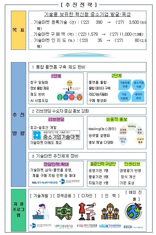 정부는 이번 개편으로 중소기업의 접근성?이용 편의성이 크게 개선되어, 기술마켓에 등록되는 중소기업 기술?제품 수(’22년 390 → ’27년 3,500건, 9배 증) 및 공공기관의 중소기업 기술?제품 구매실적(’22년 1,579 → ’27년 1조 1,000억원, 7배 증)이 대폭 증가할 것으로 밝혔다.