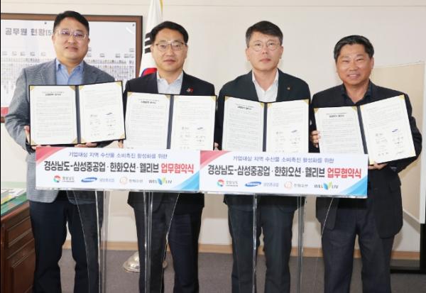 경상남도는 2일 행정부지사 집무실에서 최만림 행정부지사, 이상억 삼성중공업 총무그룹장, 박정현 한화오션 지원팀장, 류정무 웰리브 지원본부장 등이 참석한 가운데 기업대상 지역 수산물 소비촉진을 위한 업무협약을 체결했다고 밝혔다.