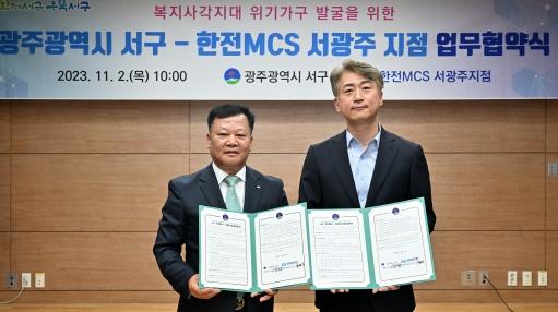 광주 서구는 2일 서구청 이음홀에서 한전MCS 서광주지점과 복지사각지대 위기가구 발굴·지원을 위한 업무협약을 체결했다. 이와 함께 한전MCS 전력매니저 25명을 명예사회복지공무원으로 위촉했다.